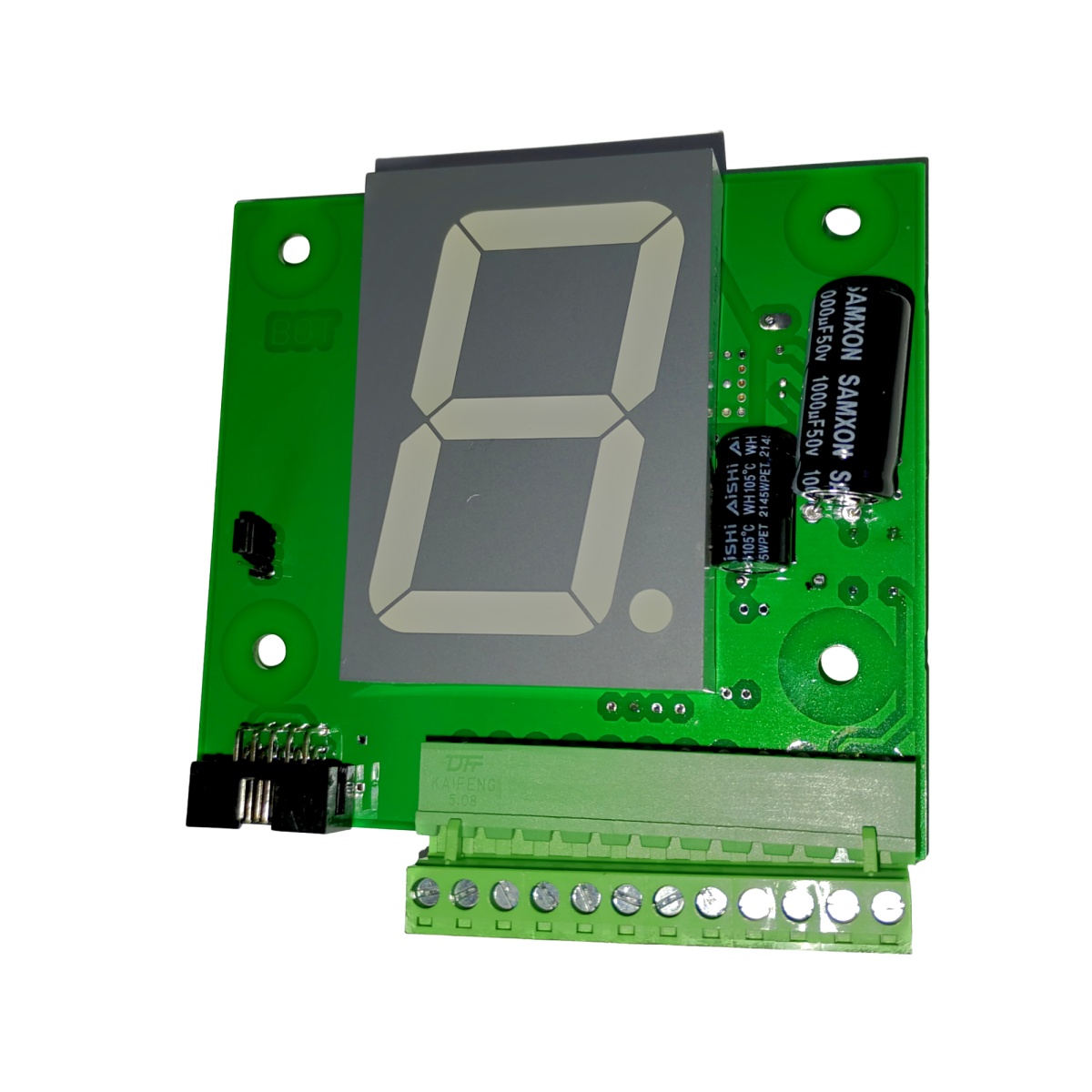 Wyświetlacz jednocyfrowy stosowany w myjniach samoobsługowych Ehrle. Moduł odpowiada za prezentację liczby dostępnych impulsów mycia. Układ elektroniczny oparto na odpowiednio rozmieszczonych komponentach, co zwiększa trwałość podzespołu i stabilność jego pracy w środowisku eksploatacyjnym myjni.