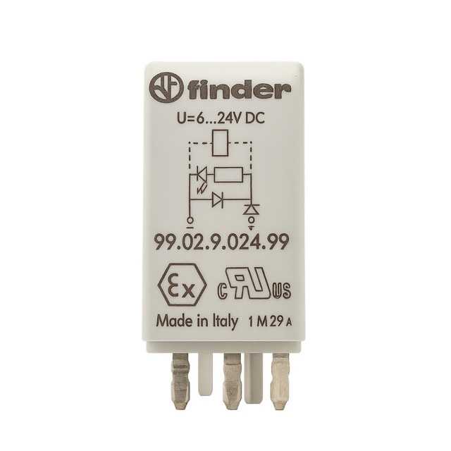 MODUŁ PRZECIWPRZEPIĘCIOWY FINDER 99.02.9.024.99 to element ochronny z diodą LED i diodą zwrotną, przeznaczony do gniazd wtykowych przekaźników elektromagnetycznych Finder. Zapewnia skuteczne tłumienie przepięć powstających przy wyłączaniu cewki prądu stałego, a jednocześnie umożliwia optyczną sygnalizację stanu zasilania.